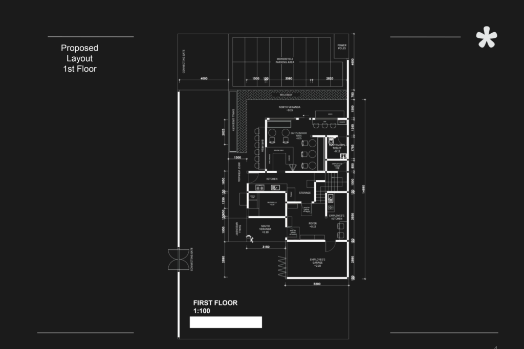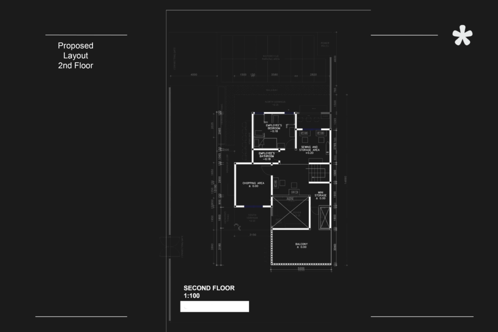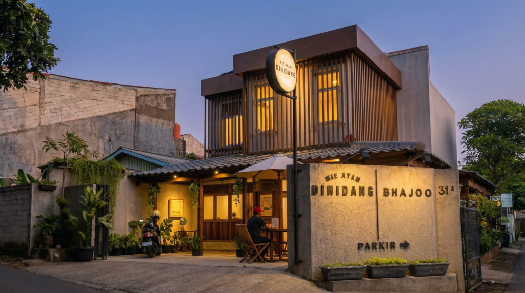 Conceived as a dual-purpose commercial space, Mie Ayam Dihidang merges the warmth of a Japanese-inspired noodle house with its sister establishment, Rumah Jahit Bhajoo. The design employs extensive timber elements—solid wood frames, panel cladding, and faux exposed ceiling beams—complemented by textured kamprot walls and distinctive blue roof tiles that reference traditional Japanese eateries. Responding to the sloped roadway, the building positions its solid wall and signage for maximum street visibility, while generous open areas accommodate shared parking. Part dining destination and part waiting lounge, the space transforms downtime into an aesthetic experience where the ritual of dining merges with the rhythm of creative enterprise.